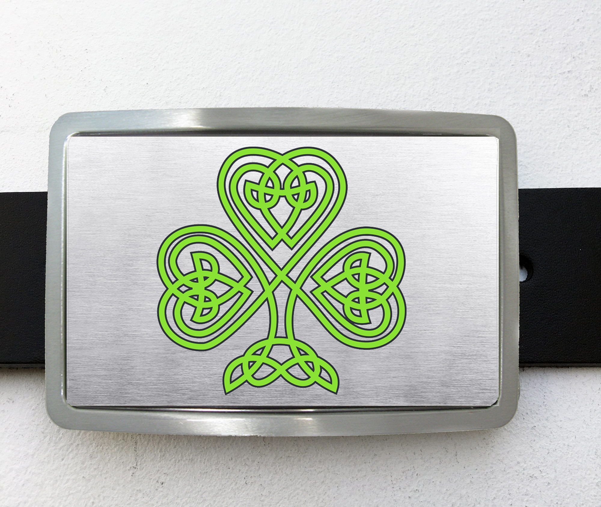 Boucle de ceinture de forme rectangle représentant un trêfle au design celtique
