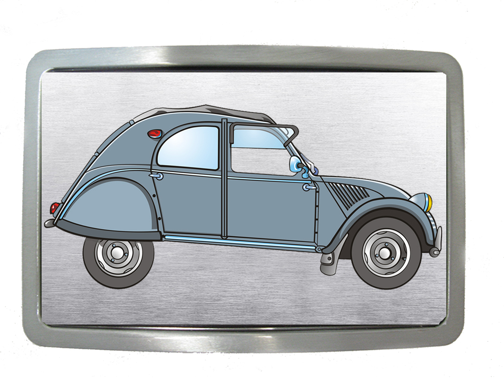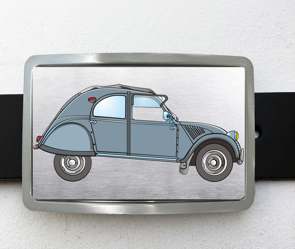 Boucle de ceinture de forme rectangle représentant la mythique Citroën 2 CV