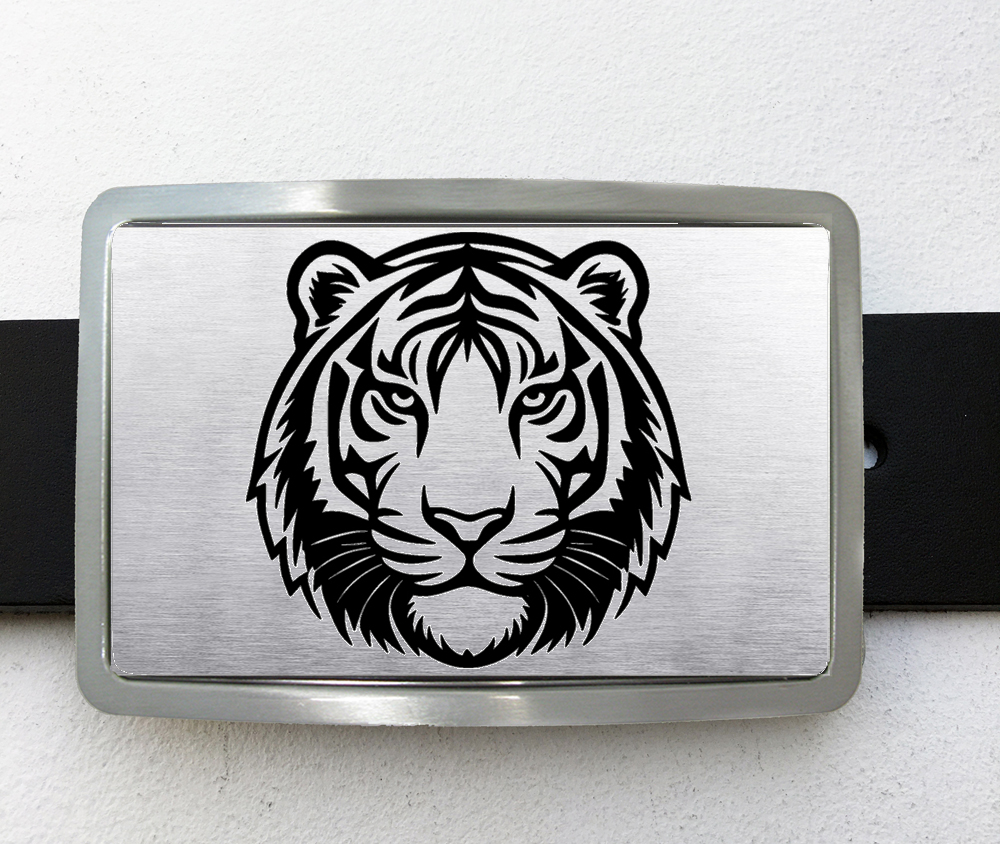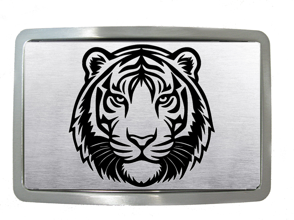 Boucle de ceinture de forme rectangle représentant une tête de tigre